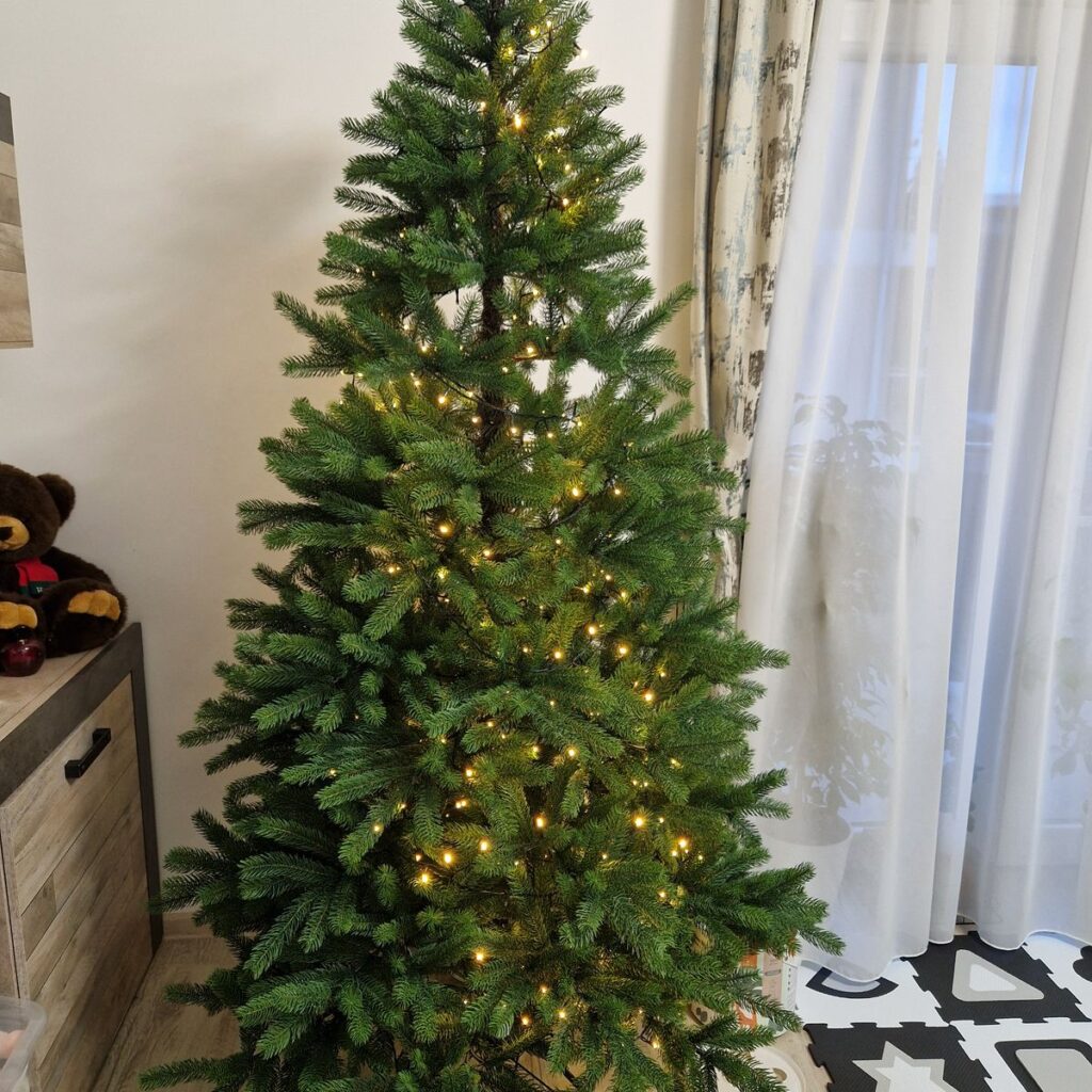 Acele sunt o combinație între nuanțele verde pal și verde închis. Datorită sistemului de pliere tip umbrelă, pomul are o formă perfectă.