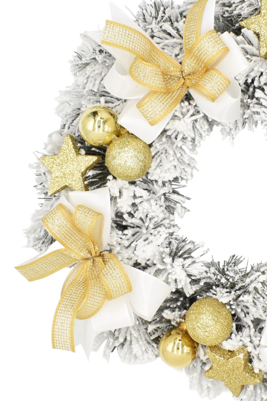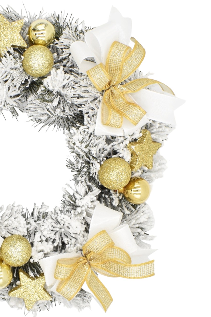 Coronița de Crăciun înzepezită și decorativă, cu un strat gros de zăpadă artificială, va aduce decorul de Crăciun la perfecțiune. Această coroniță de Crăciun are ace de pin din PVC dense, cu zăpadă bogată și bine lucrate, care sunt completate cu ornamente aurii de bun gust și fundițe albe și aurii.