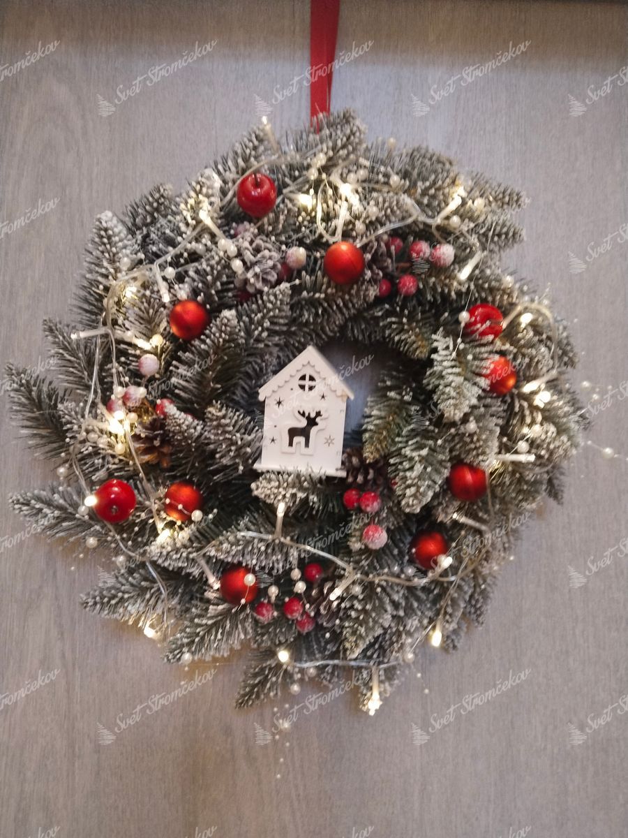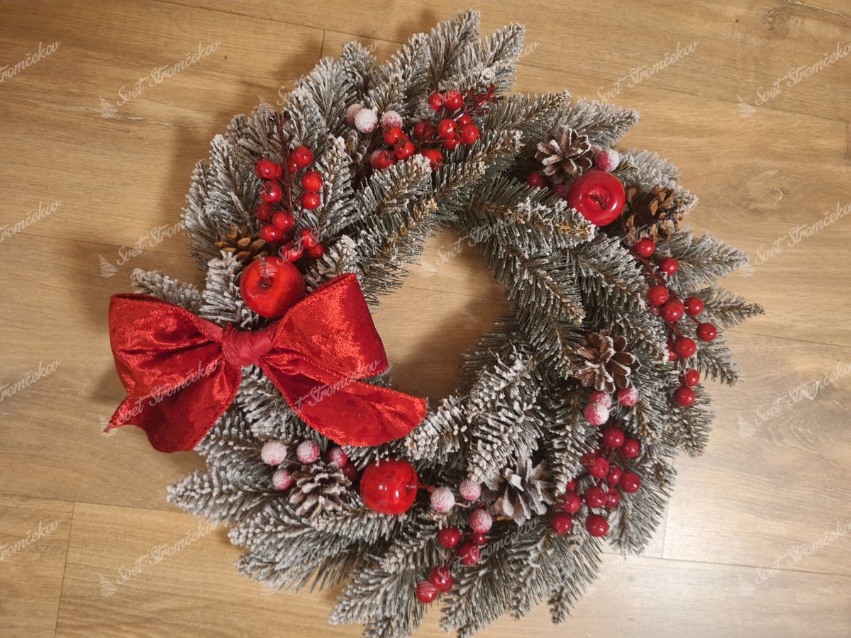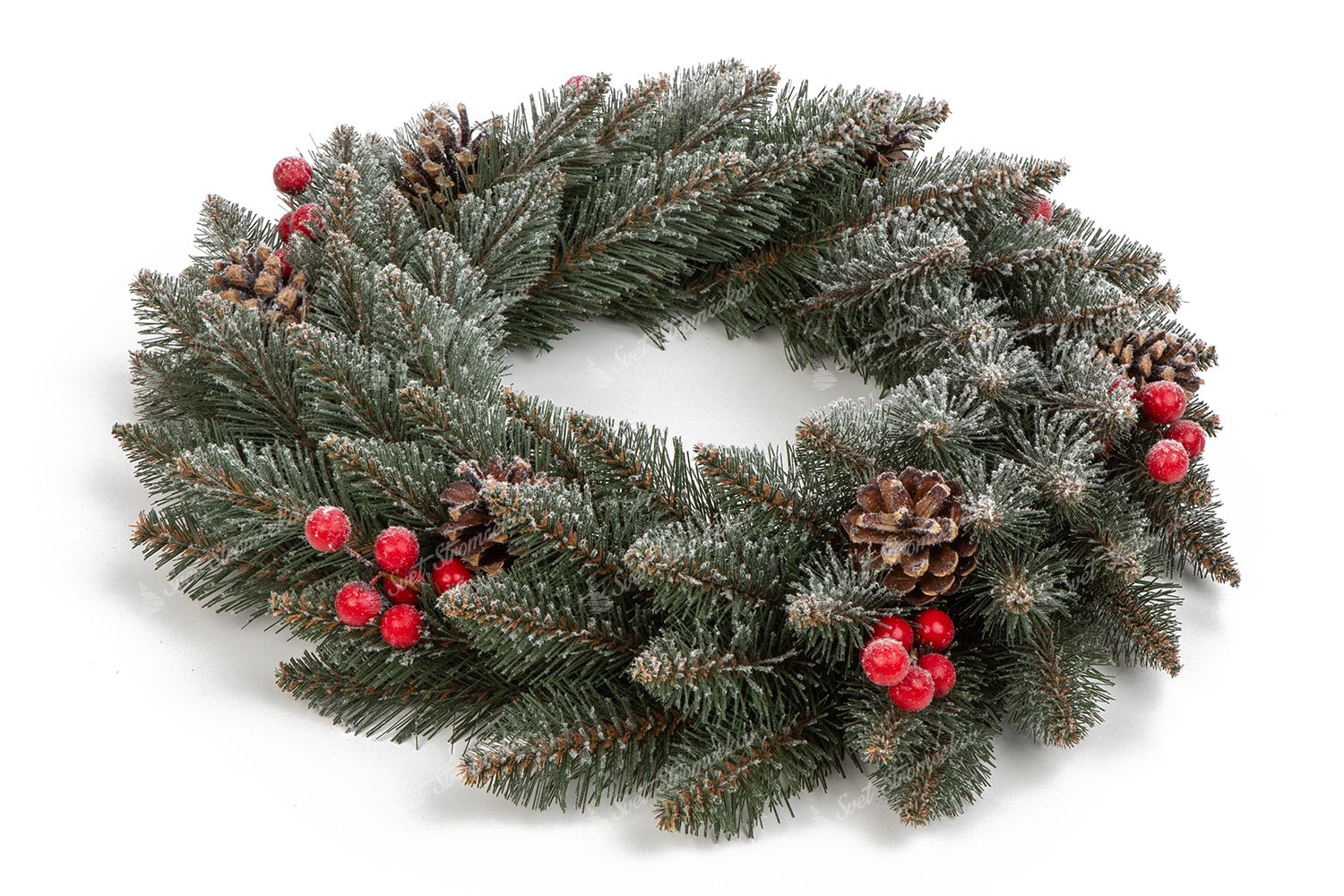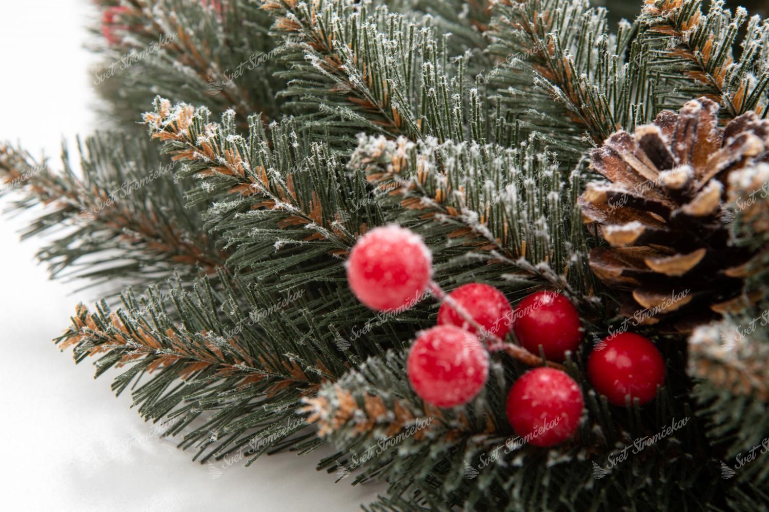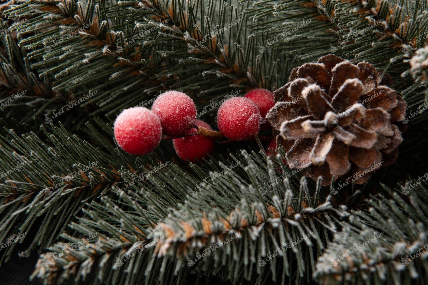 Doar în oferta noastră veți găsi Coronița de Crăciun Molid Cristal unică și exclusivistă. Crenguțele din PVC verde turcoaz sunt înzăpezite cu mici smocuri albe asemănătoare cristalelor de gheață. Această coroniță de Crăciun este completată cu fructe de pădure roșii și conuri reale de pin.
