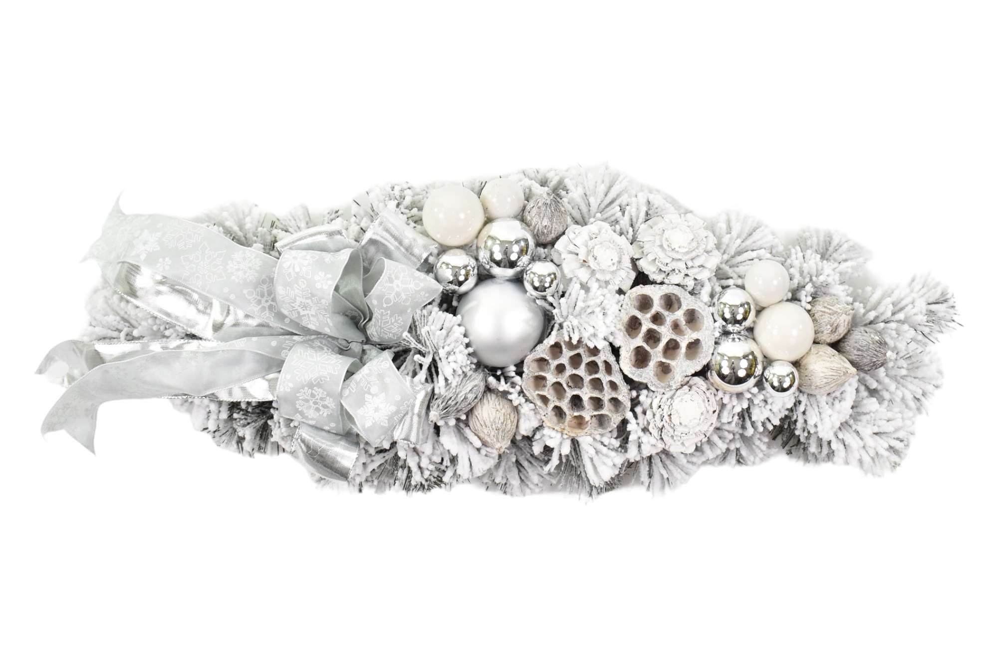 Ghirlandă de Crăciun centrală pentru masă este decorată cu bun gust în tonuri de gheață, alb și argintiu. Este dominată de globuri și decorațiuni de Crăciun în alb și argintiu și de o fundă argintie groasă.
