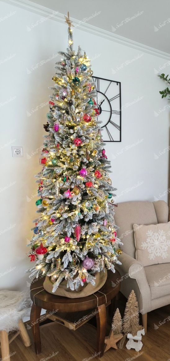 Bradul de Crăciun elegant, 3D Molid Royal Slim, este o versiune mai îngustă a unuia dintre cei mai populari brazi de Crăciun acoperiți cu zăpadă – 3D Molid Royal. Acest pom 3D îngust, acoperit cu zăpadă, are un aspect unic de gheață și forma unui con perfect.