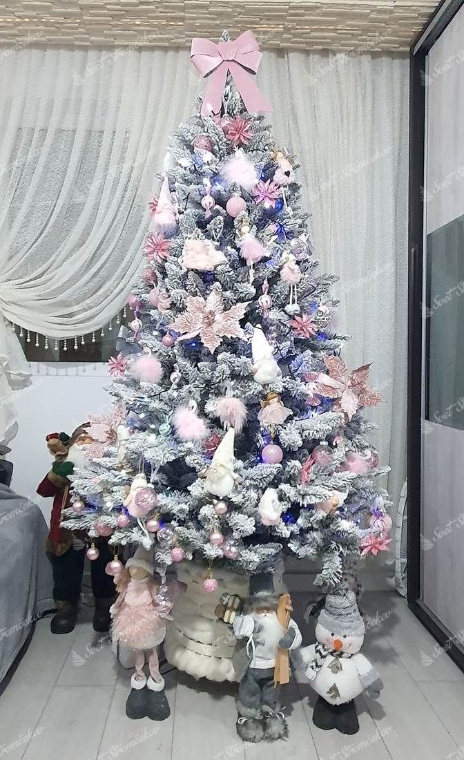 brad artificial alb de Crăciun, înălțime 220cm, lățime 125cm, ace de molid înzăpezit, ace tip PVC, design – extra dens, înzăpezit, suport metalic, lungimea vârfului – 15cm, număr de piese –3