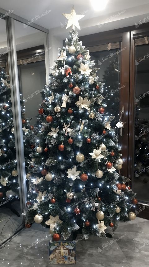 Copacul este frumos. Brut de dens. Nu vede deloc portbagajul. Ace frumoase. Stă ferm în stand. Il recomand cu caldura. 105% satisfacție. Este chiar mai frumos în persoană decât în ​​fotografie.